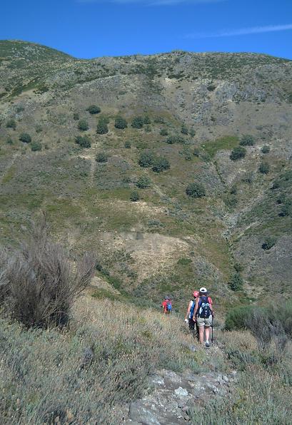 No nos equivocamos ni ellos exageraban. Piedra suelta, arbustos elevados, senderos estrechos, mala señalización... Menos mal que mi estimado cuñado Diego, que desde el primer momento tomo la cabeza de la marcha, se aplico a la tarea de marcarnos todas la señales que iba descubriendo al grito de “marca y monolito” en referencia a los Hitos que jalonaban el camino.
